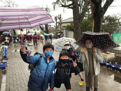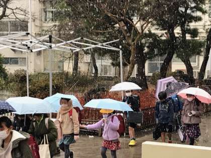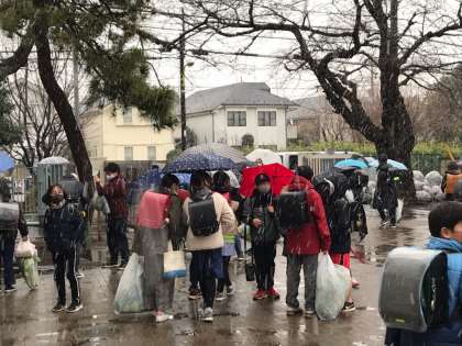 下校の時間です。寒そうに帰る子、はしゃいでいる子、さまざまな様子が見られます。
