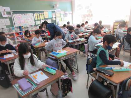 2年生の算数を参観。「1000よりも大きい数」で今日は百の位が空位である数の表し方や読み方を考える学習でした。
