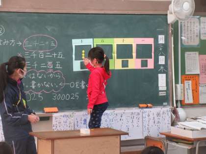 ブロックや位取り表を使っていたのでとても分かりやすく、「百は読まないけれど0は書く」としっかりをまとめることができました。