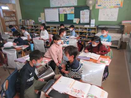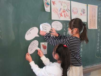 「2羽のことり」というお話を読んで、友達と話し合いながら「(誕生日会に)遅くなってごめんね」「みんなを連れてくるね」と想像した登場人物の気持ちを吹き出しに書いて、「なかよく」について考えていました。