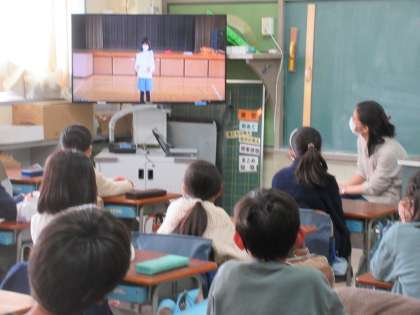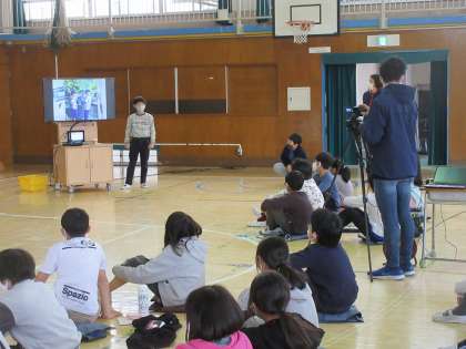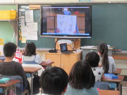 1組が体育館で発表し、2,3組は教室でライブ配信した映像で発表を聞いていました。場所は離れていましたが、子どもたちの気持ちはしっかりとつながっていました。