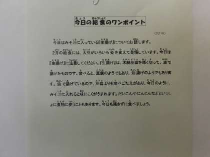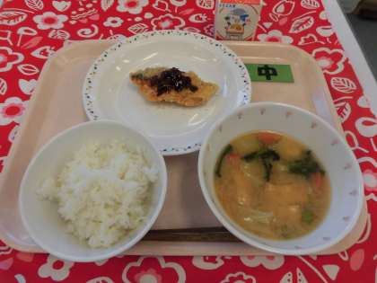 【献立】ごはん・魚フライ・生揚げのみそ汁・牛乳