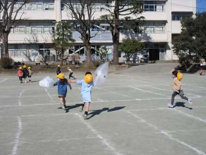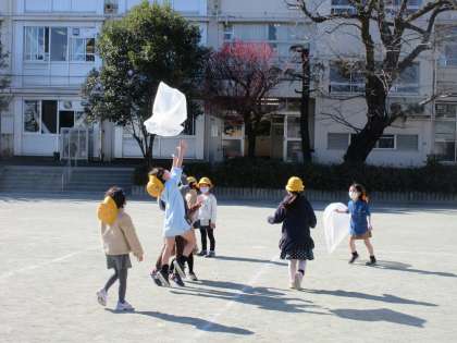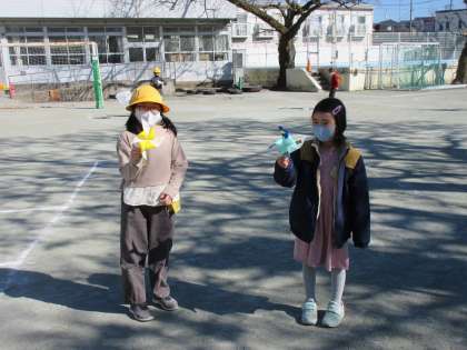 風をうまく使って遊びながら季節を感じる学習です。今日は風が強めなのでビニール袋に風を集めると風に乗り、遠くまで流されていきます。風車もよく回っていました。
