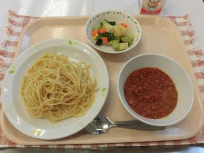 【献立】スパゲティー・ミートソース・マセドアンサラダ・牛乳