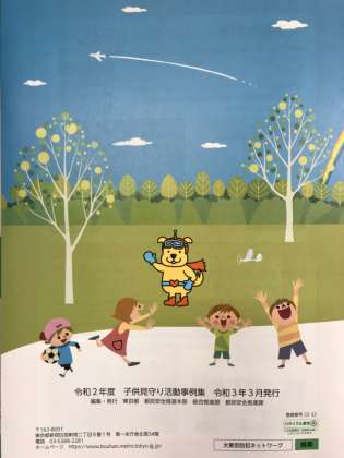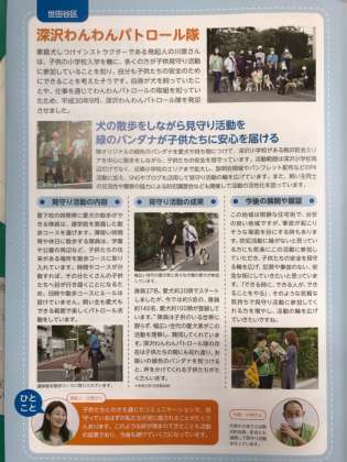 東京都で発行している、子供見守り活動事例集に、深沢わんわんパトロール隊が紹介されています。駒沢町会の見守りと連携して行われるこの活動、緑のバンダナが目印です。表紙のイラストも、実はパトロール隊の一員がモデルだそうです。
