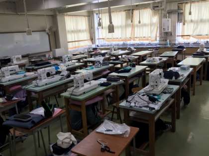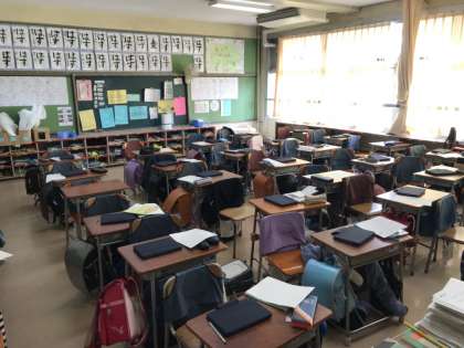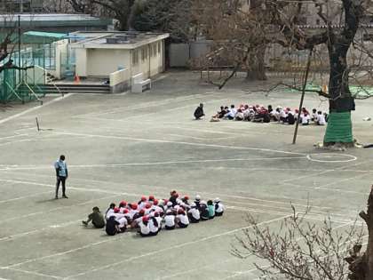 今日は一年間の訓練の総まとめです。授業中の地震を想定し、緊急地震速報に続いて、地震の音に合わせて、机の下に避難したり、校庭の中心に集まったりしました。