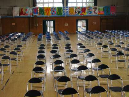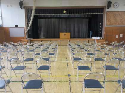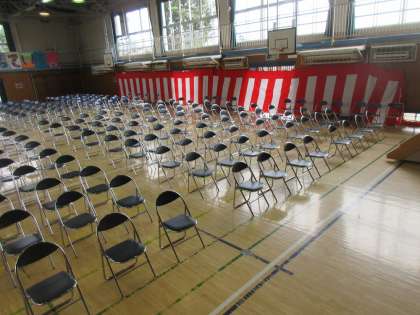 今日主事さんが体育館に紅白幕といすの設置をしました。体育館後方には後輩からのメッセージが飾られました。卒業式に向けて動き出しました。これから体育館で6年生の活動が始まります。