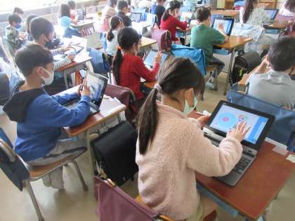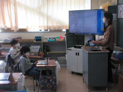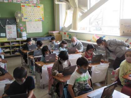 1年生が学校のタブレットを使った学習。起動のさせ方やアプリの開き方、お絵かきソフトでの絵の描き方などを先生に丁寧に教わっていました。