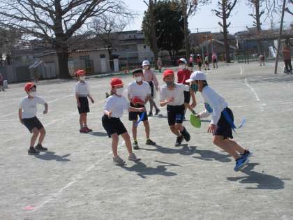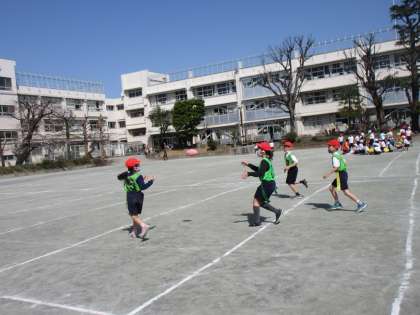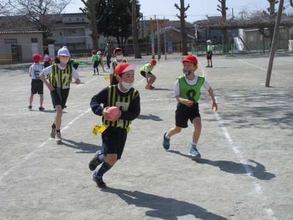 3年生はタグラグビーの学習。ボールを後ろにパスをする、腰のひもをとるとタックルの成立といったルールにも慣れ、楽しく取り組んでいました。