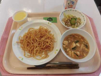 【献立】焼きそば・麻婆豆腐・白菜の中華サラダ・フルーツ入りホワイトゼリー