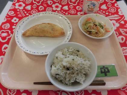【献立】わかめごはん・ジャンボ餃子・春雨サラダ・牛乳