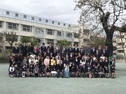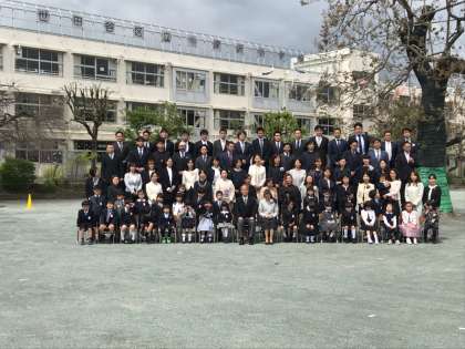 式の終了後は、校庭で集合写真の撮影です。1組と2組の様子です。