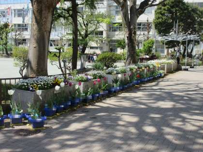 昨年度の栽培委員の子どもたちが植えた花壇の花が満開です。今の2年生が育てているチューリップもきれいな花を咲かせています。