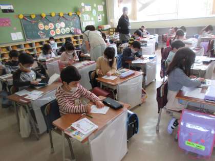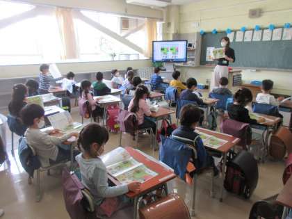 1年生の学習も少しずつ進んできました。教科書を使って算数の学習をしたり、生活科でカードを書いたりしていました。図書の時間では図書の先生が読み聞かせをしてくれていました。