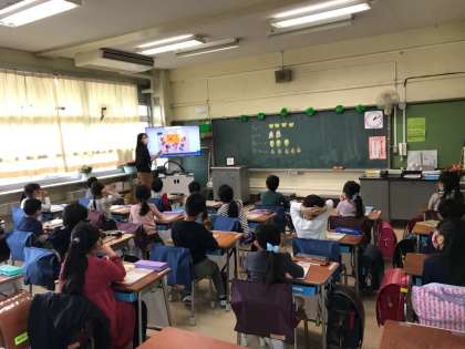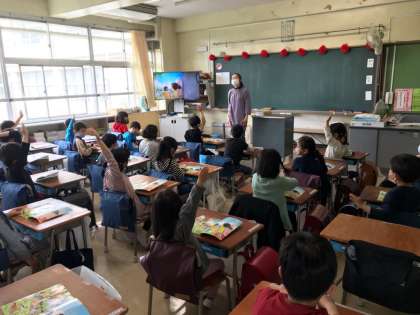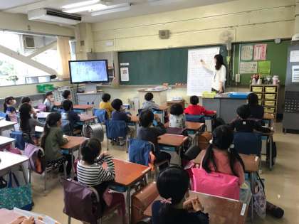 発言のルールを学んでいるクラス、音楽でさんぽを歌っているクラス、算数の教科書を見ながら数を数えるクラスの様子です。