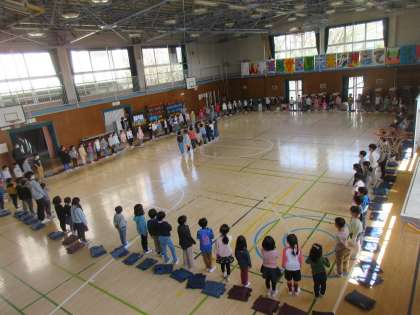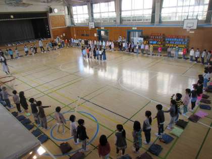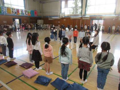 1年生は4クラスが体育館に集まり、1年生を迎える会の出し物の練習をしていました。入学して1週間がたち、学校生活にもだいぶ慣れてきました。