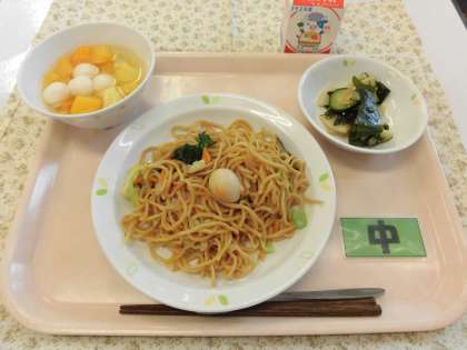 【献立】五目焼きそば・大根の中華味・フルーツ白玉・牛乳