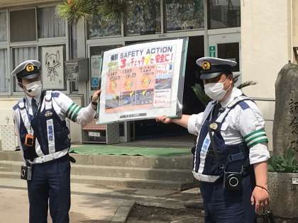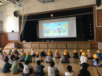 4クラスを二つに分け、体育館で動画を見ながら交通安全について学ぶと共に、実際に通学路に出て交差点の渡り方を確認しました。