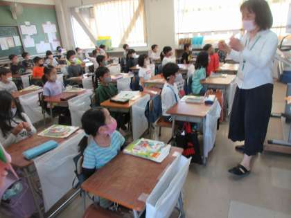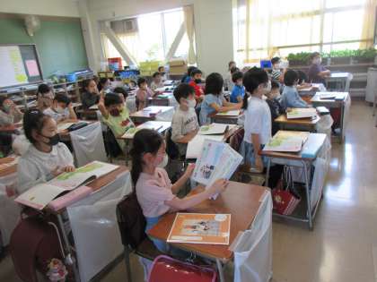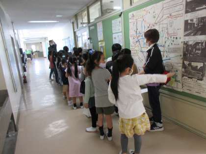 1組は道徳で自分の考えを発表していました。2組は講師の先生と音楽の学習。校歌を歌っていました。3組は生活科の学校探検。校内マップを持ってどんな部屋があるのか確かめていました。