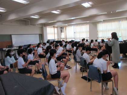 音楽ではリコーダーの学習を少しずつ始めようと考えています。この日の授業では子どもたちは実際にリコーダーを手にして指使いの復習をしました。
