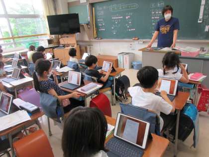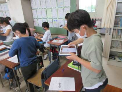 3年生の理科を参観。校庭の生き物を端末を使って学習。