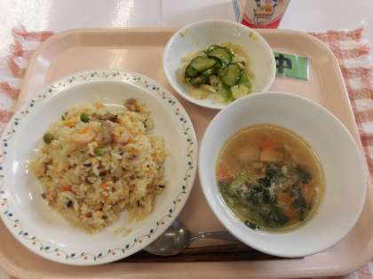 【献立】チャーハン・とり肉と青菜のスープ・中華和え・牛乳