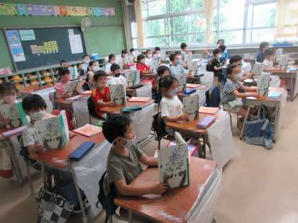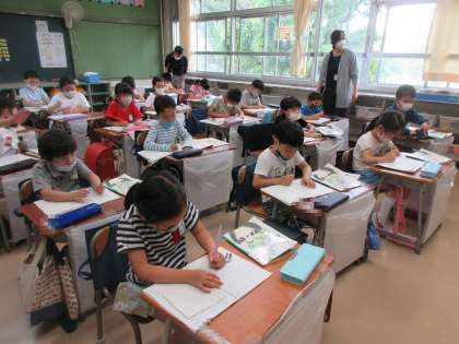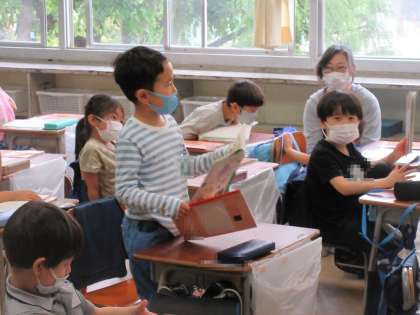 1年生の国語の物語の学習を参観。子どもたちは教科書を音読したり、自分の考えを発表したり、ノートを書いたりと学習の仕方が身に付いてきています。