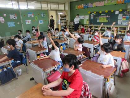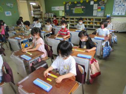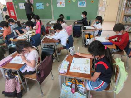 1年生の他学級の算数を参観。0の学習でした。イチゴを食べた時の残りの数や輪投げの入った数などで0についてイメージを考えました。先生の話を聞いて発表したり、ノート学習に取り組んだりとしっかりと学習していました。