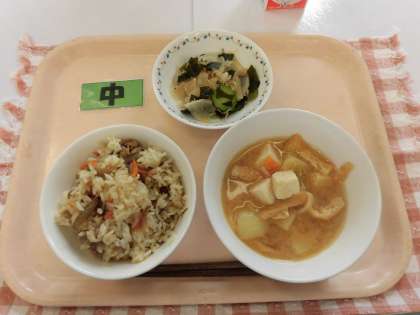 献立】豚肉とごぼうのごはん・じゃこサラダ・みそ汁・牛乳
