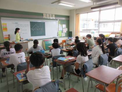 3クラスの6年生は4つの教室に分かれて授業を受けています。算数ルームでは少人数担当教員の先生の授業。子どもたちは少ない人数で自分のペースで学習をしています。
