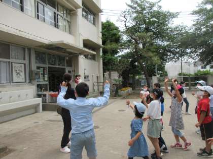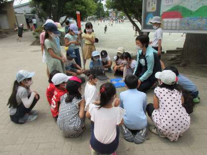 3年生が教室で育てていたアゲハがちょうになり、水槽から放していました。ちょうは子どもたちの歓声とともに空高く飛んでいきました。