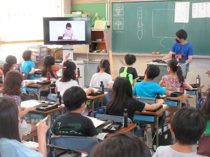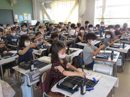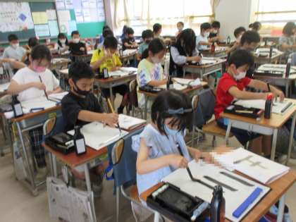習字の学習は3年生からです。映像をを見ながら基本を学んでいます。墨をつけて実際に書くときはどきどきわくわくしながら真剣な様子です。