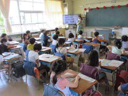 今日1年生と2年生に学習端末を配布しました。教室では端末の扱い方を先生から教えてもらっていました。これで全学年の子どもたちに配布をすることができました。