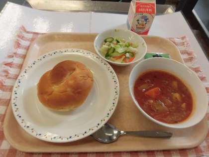 【献立】パインパン・トマトシチュー・キャベツとアスパラのサラダ・牛乳