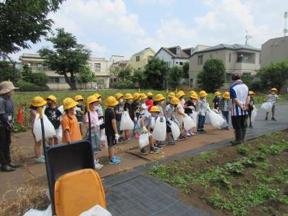 秋山農園さんの畑での収穫体験「自然の教室」が始まりました。本校は全学年の子どもたちが季節の旬の野菜を収穫させていただきます。