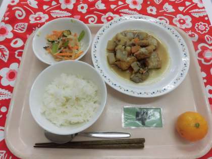 【献立】ごはん・五目うま煮・糸寒天と野菜の和え物・冷凍みかん・牛乳