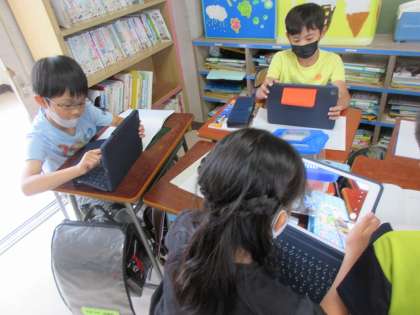 3年生は育てているモンシロチョウの幼虫がさなぎになりました。今日はさなぎの観察。タブレットでさなぎの写真を撮り、拡大するとさなぎの様子を詳しく観察することができます。