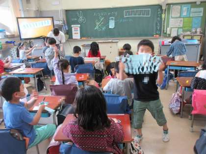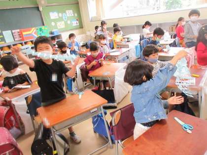 髪を折ってはさみで切って七夕の飾り作り。等間隔で交互にはさみを入れます。切って広げて飾りができると子どもたちは大喜びでした。