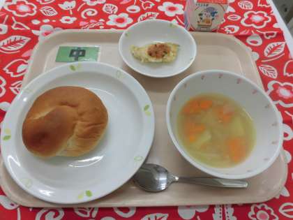 【献立】ミルクパン・魚のラビゴットソース・豆入り野菜スープ・牛乳