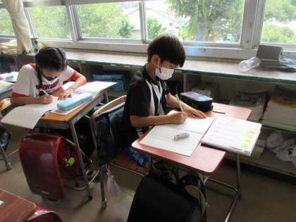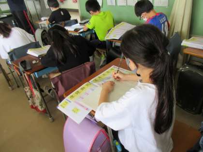 新出漢字の学習。子どもたちは集中して丁寧にノートに書いていました。