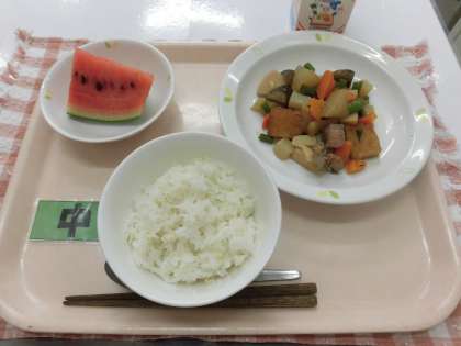 【献立】ごはん・がめ煮・小玉すいか・牛乳