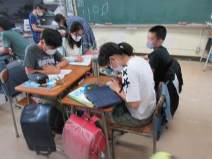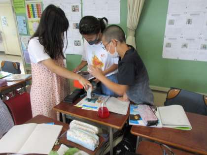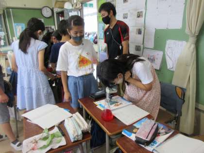 植物の水の通り道を顕微鏡で観察していました。タブレットを上手に使っている子もいました。子どもたちは仲良く、協力的に学習しています。
