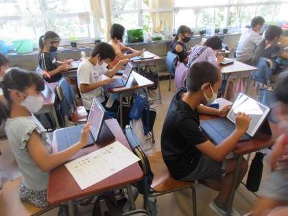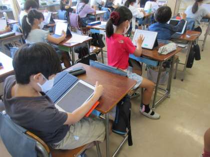 4年生が昨日配布したアカウントで学習アプリ「キュビナ」の設定をしました。これで個人で端末を使って国算理社の4教科の学習ができるようになりました。設定後は自分の好きな教科の問題を楽しそうに解いていました。
