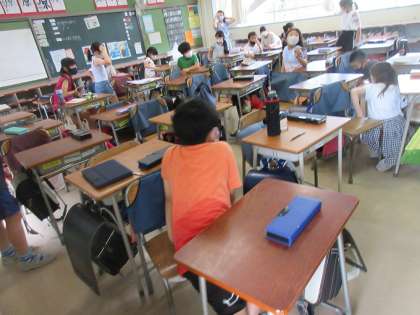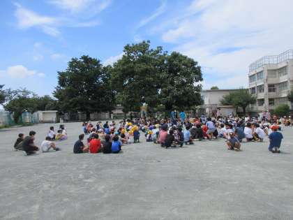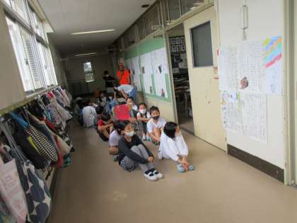 今日は中休みの地震が起きた時の訓練。子どもたちは校庭や教室など、その場に応じた避難の仕方を考え、行動します。