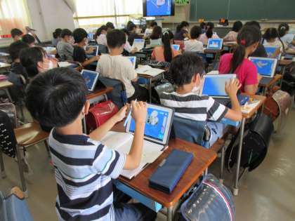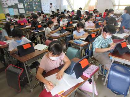 端末を使うと知りたいことを詳細に調べることができます。子どもたちはモンシロチョウの体について詳しく調べていました。