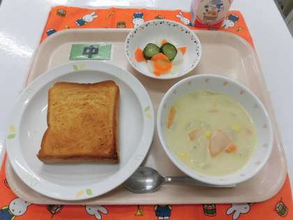 【献立】ガーリックトースト・コーンシチュー・ピクルス・牛乳