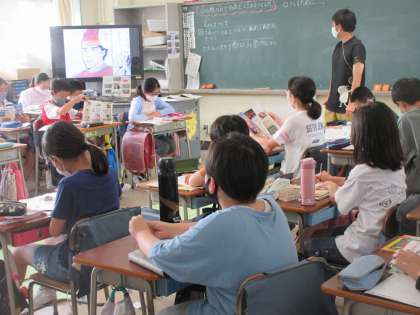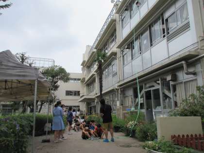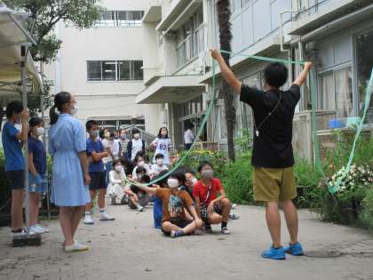 6年生が3階の教室からスズランテープを地面までで垂らしていました。どうやら長さ(高さ)を知りたいようです。これは社会科の学習です。大仏の大きさを実感するための活動でした。
