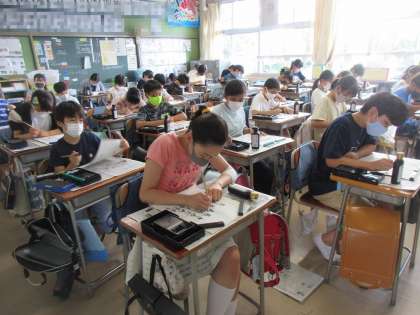 芭蕉の句を小筆で書く練習をしていました。さすがは6年生です。集中をしていて、落ち着いた学習態度です。