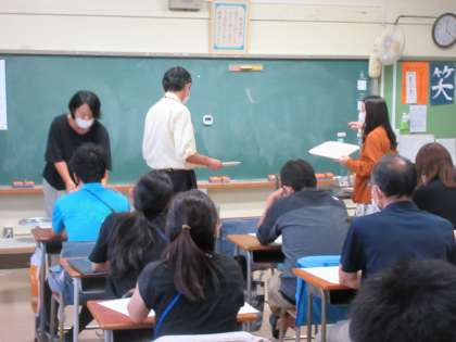 明日から給食が始まります。先生たちは給食を安全に行うために意見を出し合い、手順や方法を考えていました。