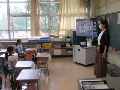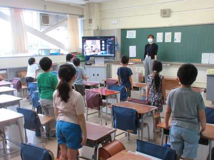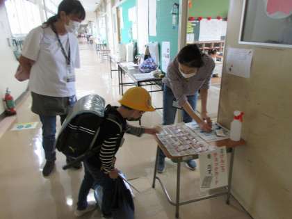 1年生の朝の様子です。教室の入り口で健康チェック。その後朝の会ではTeamsで自宅と教室をつないで朝の会が始まりました。